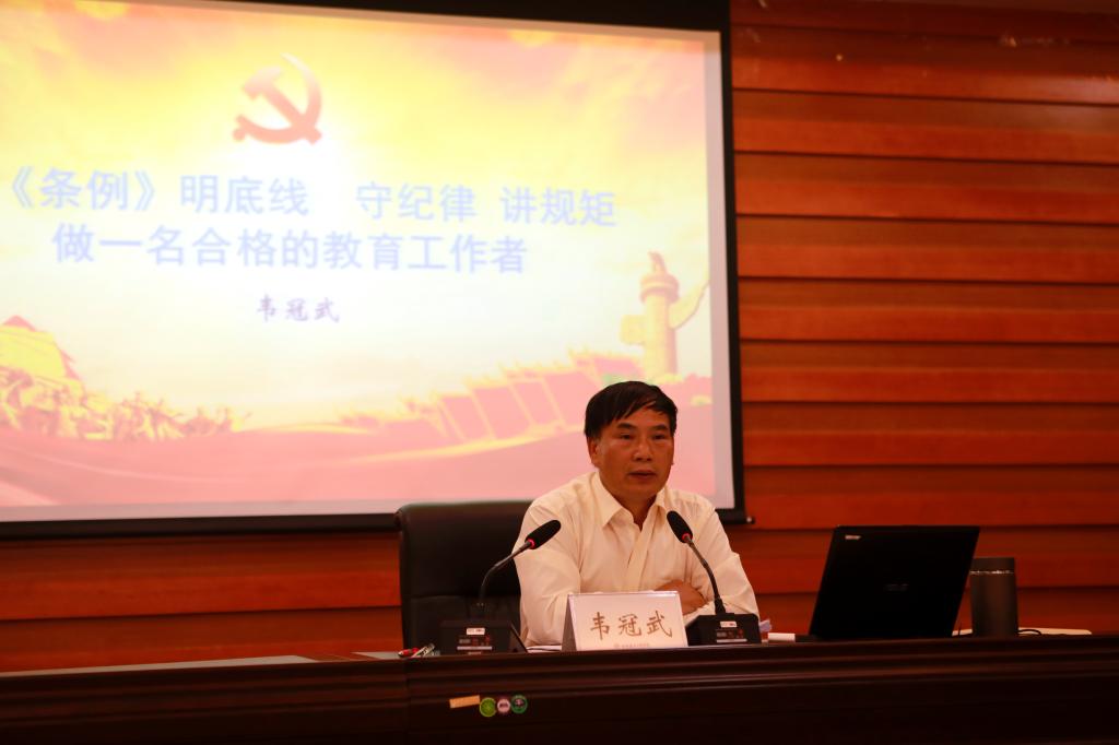 11月5日,学校全体党员中层领导干部和科级干部参加了新修订的《PA视讯官方网站纪律处分条例》的学习,校纪委书记韦冠武做了题为《学<条例>明底线 守纪律 讲规矩 做一名合格的教育工作者》的专题辅导讲座。