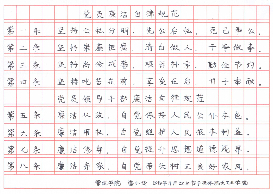 10月18日,中共中央印发了修订后的《PA视讯官方网站廉洁自律准则》(以下简称《准则》)。《准则》贯彻党的十八大和十八届三中、四中全会精神,坚持依规治党和以德治党相结合,紧扣廉洁自律主题,是党执政以来第一部坚持正面倡导、面向全体党员的规范全党廉洁自律工作的重要基础性法规,具有重要意义。为使领导干部更好的学习新《准则》,将《准则》内容铭记于心,特开展此次硬笔书法比赛活动。